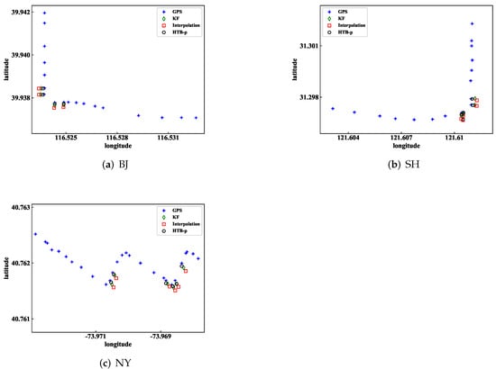 From Figure 7 show the effective of KF algorithm, Interpolation algorithm and HTB-p algorithm on restoring the trajectory, and compare it with the actual GPS trajectory. Figure 7a shows the restoration of a continuous trajectory based on taxis in Beijing. According to the four position of the missing trajectory selected in Figure 6a, it can be seen that the position information restored by HTB-p is better than that of KF and Interpolation algorithm. Figure 7b shows the restoration of a continuous trajectory based on taxis in Shanghai. According to the five position of the missing trajectory selected in Figure 6b. Figure 7c shows the restoration of a continuous trajectory based on taxis in New York. According to the six position of the missing trajectory selected in Figure 6c.