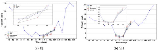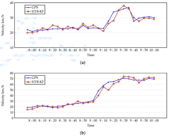 Velocity information reconstruction by different algorithms. (a) The variation of HTB-KF compare with Beijing truth GPS trajectory data velocity at 9:00–11:00. (b) The variation of HTB-KF compare with Shanghai truth GPS trajectory data velocity at 18:00–20:00.