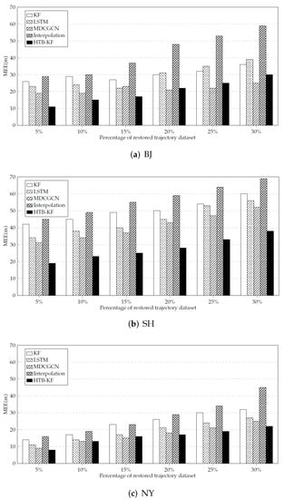 Firstly, HTB-KF is compared with the existing trajectory completion algorithm. From Figure 9 shows that the restoration of three trajectory datasets by different algorithms, and the effect of algorithm restoration through MEE.