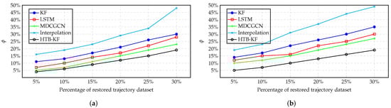 Figure 10 represent the restoration of velocity information in the trajectory segments of two datasets by different algorithms. Figure 10a restores the information in the trajectory set in Beijing. It can be seen from the figure that with the increase of the number of restored samples, the error rate of KF, LSTM, MDCGCN and HTB-KF algorithms is also increasing, but the growth slope is lower than that of other algorithms.