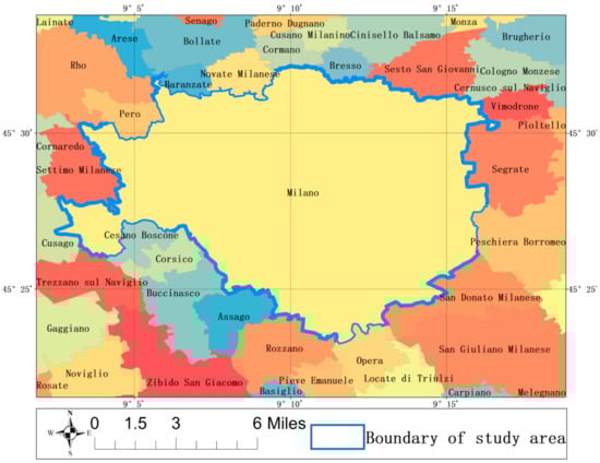 This study was conducted in Milan, which is the second largest city in Italy and a world-famous international metropolis. The city is located in the north of Italy in Lombardy plain (capital of Lombardy region and Milan City), with a permanent population of about 1.47 million and an area of about 181 square kilometers. The GDP of the Milan metropolitan area accounts for 4.8% of Italy’s GDP. In addition, the city is the most densely populated and industrially developed area in Europe. Figure 1 shows the geography of the study area. The authors used two types of experimental datasets: the telephone dataset and the related geographical features dataset.