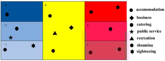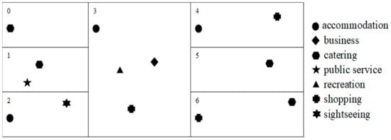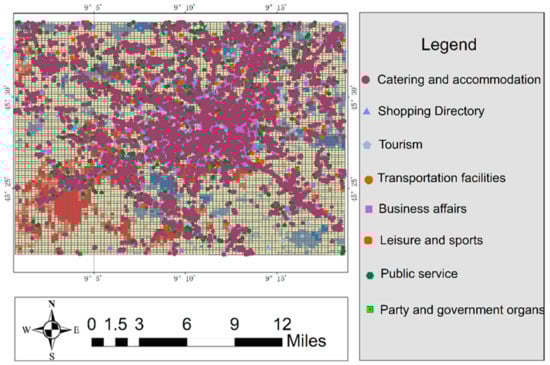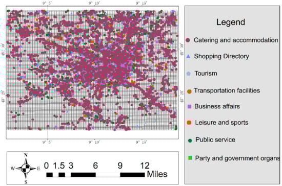 The point-of-interest (POI) dataset was derived from OSM (https://github.com/openstreetmap, 12 January 2021). It can be divided into eight categories: transportation services, leisure, business, public services, catering and accommodation, party and government organs, sightseeing, and shopping. The overlay map between the POI dataset and the grids is shown in Figure 4.