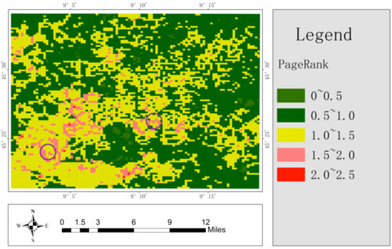 The experimental spatial interaction records were collected from November 1 to 7 in 2013, and one aggregation network was constructed, which included 10,000 nodes and 1,169,475,402 edges. For each node in the network, the authors used the Algorithm 1 to calculate its PageRank value. Based on the corresponding grids of the nodes, the thematic map of nodes PageRank values were obtained, as shown in Figure 12.