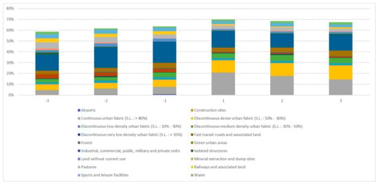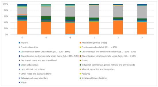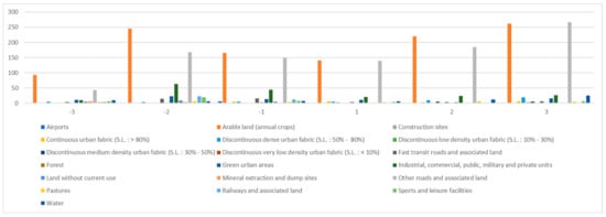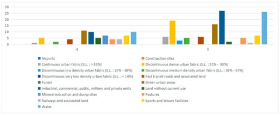 As can be seen from Figure 16, whether it is a cold spot or a hot spot, the two types of land-use dataset, arable land (annual crops) and other roads and associated land, have a large grid number. The reason is that the southern part of Milan city focuses on the development of agriculture and transportation systems. Then, to make a more accurate analysis, the authors eliminated these two types of land-use datasets, and compared only other types of land-use datasets in the coldest/hottest regions. The results are shown in Figure 17.