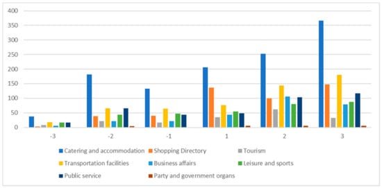 As can be seen in Figure 20, industrial, commercial, public, military, and private units account for a larger proportion of different levels of cold and hot spots, and the proportion in the hot-spot areas is larger than that in the cold-spot area. The relative entropy values between −3 and 3, −2 and 2, −1 and 1 are 0.595, 0.609 and 0.638 respectively, which further verifies that the land type area in cold-spot area and that in hot-spot area are significantly different.