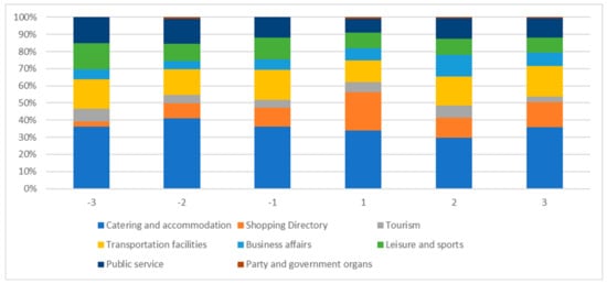 Similarly, the authors further experimented to compare the ratios of types of the POI dataset contained in the hot/cold regions. The results are shown in Figure 21. The authors can see that for shopping directory and business affairs, the proportion of hot spots is significantly greater than that of cold spots, while for leisure, sports, and public service, the opposite is true. The relative entropy is 0.959, 0.925, and 0.973, respectively. It can be seen that there are some differences between cold-spot region and hot-spot region in the distribution area of POI. The distribution ratio of POI in the cold-spot area is relatively consistent, while the distribution ratio of POI in the hot-spot area fluctuates to some extent. The ratio of POI in the hot-spot area is also slightly greater than that in the cold-spot area. Thus, the experimental results are consistent with the real situation that people are mainly engaged in industrial and commercial activities in the hot-spot regions, while people in cold-spot regions are mainly engaged in leisure and entertainment activities.