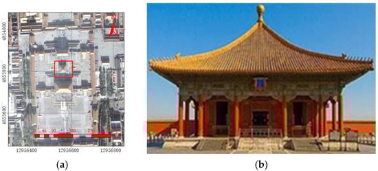 The Hall of Complete Harmony (中和殿) with a single-eave pyramidal roof is located between the Hall of Supreme Harmony (太和殿) and the Hall of Preserved Harmony (保和殿) on the central axis of the Forbidden City (Figure 1a). It is one of the most famous examples of the Ming and Qing Dynasties’ official-style architecture (Figure 1b), and is known as one of Three Great Halls of the Forbidden City. Built in 1420, the Hall of Complete Harmony was square in plane, and covered an area of approximately 580 , with 3 rooms wide and 3 rooms deep, respectively. The maximum height from the top of the baoding to the ground was 19 m.
