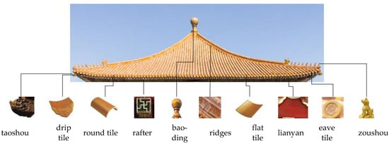 The roof of the Hall of Complete Harmony has four slopes. Each slope is covered with yellow glazed tiles, including round tiles (筒瓦) and flat tiles (板瓦) which are distributed in the form of staggered parallel rows. The drip tiles (滴水), eave tiles (瓦当), lianyan (连檐) and rafters are located at the roof eaves, respectively. The number of vertical ridges which intersect at a copper tire gilded baoding (宝顶) is equal to the number of the slopes. Different types of zoushou (走兽) are distributed at the ends of the ridges. Four taoshou are at the four roof corners. Figure 2 shows the various components constituting the roof.
