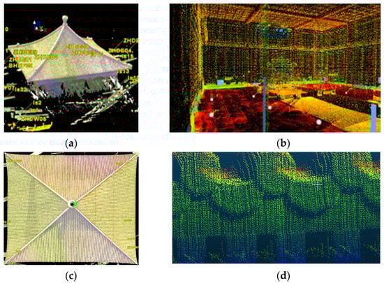 (a) The overview of the captured point cloud; (b) the interior of the Hall of Complete Harmony; (c) the roof; (d) the details of the roof eave.