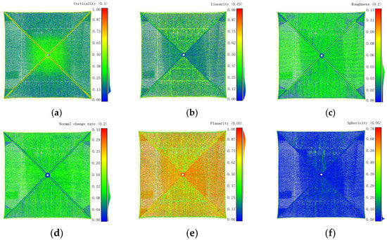 (a) Verticality; (b) linearity; (c) roughness; (d) normal change rate; (e) planarity; (f) sphericity.