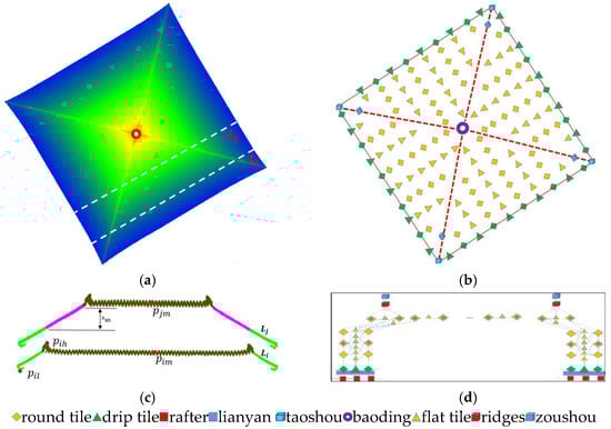 (a) The top view of the Hall of Complete Harmony; (b) the placements of the components on the plane; (c) the section lines; (d) the distribution of roof components along the section line.