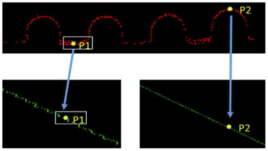 The arrangement of the flat tiles and round tiles also show a strong regularity in a local area along the section line. As shown in Figure 7, and are the points on the flat tile and the round tile, separately. Obviously, the points that belong to the flat tile are at the bottom of the local area between the two round tiles, and the height of these points is almost the same. Hence, the local height difference (LHD) between a point and the lowest point within a local area of the current point along the section line was applied in this paper. The size of the local area can be defined as being double the width of the round tile. The LHD of the point on the section line is expressed as follows:
