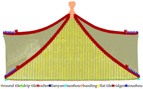 After merging scans, the average error of the target balls used as registration features was less than and the root mean square (RMS) error of overlap points between different scan stations was about . Although there was some noise around the eave tiles, the overall quality of the point cloud was still very high and could be used for the semantic segmentation directly. The captured point cloud of the Hall of Complete Harmony was shown in Figure 3. The point cloud density of the Hall of Complete Harmony was 43,416 2. To support the process of the Scan-to-BIM, we divided the roof components into nine classes: zoushou, ridge, flat tile, baoding, taoshou, lianyan, rafter, drip tile and round tile.