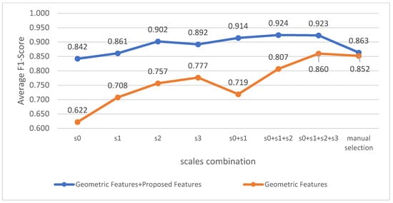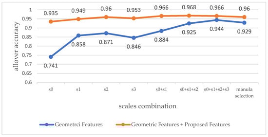 As shown in Figure 14, the highest classification accuracy based on the single-scale geometric feature vector was 87.1% and the lowest classification accuracy based on the multi-scales geometric features was 88.4%. Similarly, when the proposed features were added, the lowest classification accuracy of multi-scale long feature vectors was also higher than the highest classification accuracy of single-scale features vectors. Hence, compared with the single-scale feature vectors, the multi-scale long feature vectors (such as , , ) performed better when the same features were applied.