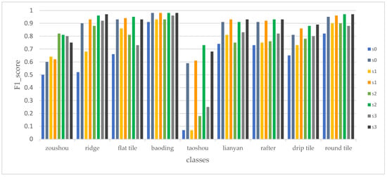 The segmentation result of the Hall of Complete Harmony’s roof is shown in Figure 11. Table 4 shows that the highest OA reached 96.8% when the proposed features were added at the s0 + s1 + s2 scales. Besides the OA, a rigid evaluation index, the average value of F1_score, was also applied to lower the impact of the quantitative variation of points within different categories in performance evaluation. As is shown in Figure 12, the lowest average value of F1_score was 62.2% only relying on the regular geometric features at the s0 scale, and the highest average value of F1_score (92.4%) still occurred when the proposed features were added at the s0 + s1 + s2 scales. Obviously, when the proposed features were added, the average F1_score was higher than that only relying on the regular geometric features at the same scale or the scale combination. On the other hand, the multi-scale feature connection strategy also improved the average F1_score.