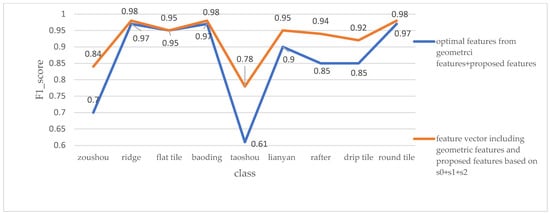 In addition to the overall accuracy, the proposed features also obtained good performance on the classification accuracy of each class. As shown in Figure 14, except the class zoushou, the of the other classes was higher than that without the proposed features. Although the of zoushou was lower, the highest difference was less than 5% at the same scale. This showed that the proposed features had good performance on the classification of the roof point cloud.