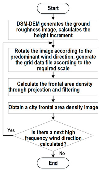 In this research, the height increment image projection method is used to calculate the windward area of buildings in each grid, and then divided by the grid area to automatically calculate the frontal area density of each grid. During the projection, the ground objects low to the ground (such as small shrubs) and ground objects of small width (such as telephone poles) should be filtered by defining the threshold. Figure 1 shows the calculation process of frontal density area.