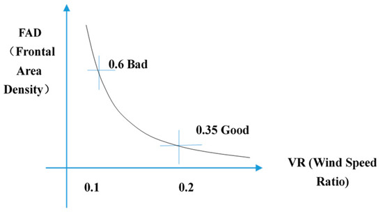 Figure 2 shows the inverse relationship between FAD and the parabolic wind speed ratio. The smaller the FAD value, the smaller the obstruction through the area, and the higher the wind speed, the better the ventilation efficiency.