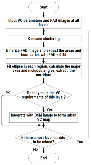 We can discriminate whether the corridor is a ventilation corridor as follows: 2a*grid length ≥ the corridor length at that level, |-| ≤ the angle standard at that level (30 degrees for CCI, 45 degrees for CCII and CCIII), and also the extracted corridor width pixel*grid length ≥ the corridor width at that level.