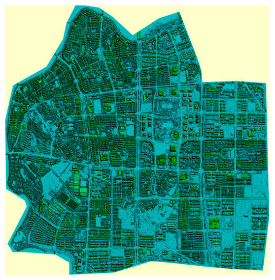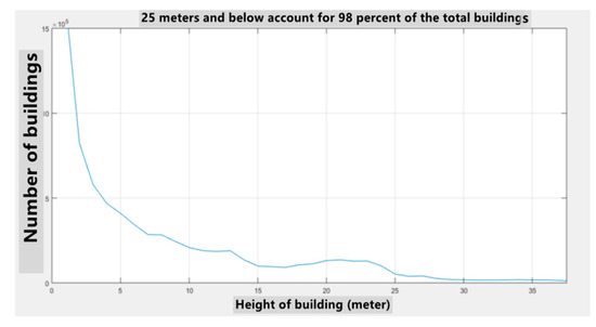 The urban buildings were counted after removing street trees and telegraph poles, as shown in Figure 6. Buildings with height of 25 m or less accounted for 96.83% of the total, so the height increment of urban areas is 25 m.