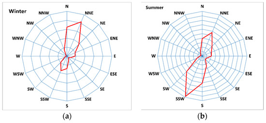 Urban wind rose chart in the Zhuji urban area. (a) Wind rose chart in winter; (b)wind rose chart in summer.