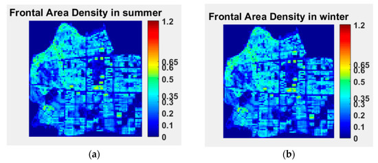 According to the dominant wind direction, the frontal area density of the Zhuji urban area in winter and summer is calculated by dividing it into 50 m grids, as shown in Figure 8 below.