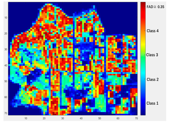 In this research, for FAD clustering of the frontal area density of the case city, assuming k = 1–5, the clustering range and median value are obtained to have a general impression of the case city FAD distribution. Based on the empirical importance of various literature, the FAD value of the ventilated corridor area should be less than 0.35. Based on this, according to the general classification of ventilation potential into excellent, good, acceptable and poor, set K = 4, using K-means clustering, obtains <0.04, 0.14~0.25, and 0.25~0.34 for four categories, which are represented, respectively, by progressive color changes from blue to red, as shown in Figure 9.