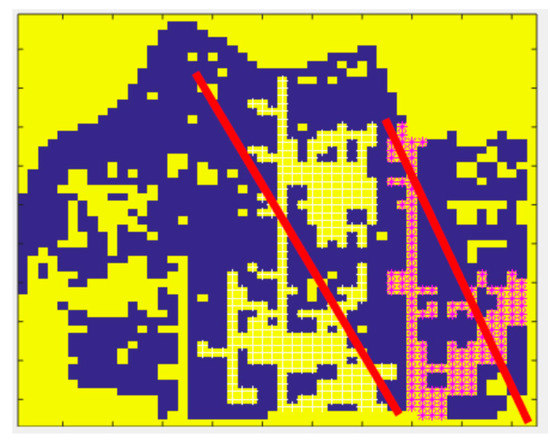 The system is automatically associated with the urban DSM map. The operator can segment a large area by connecting or disconnecting individual FAD points (resetting these points) according to the actual situation to form a place close to the width of the ventilated corridor, as shown in Figure 11.