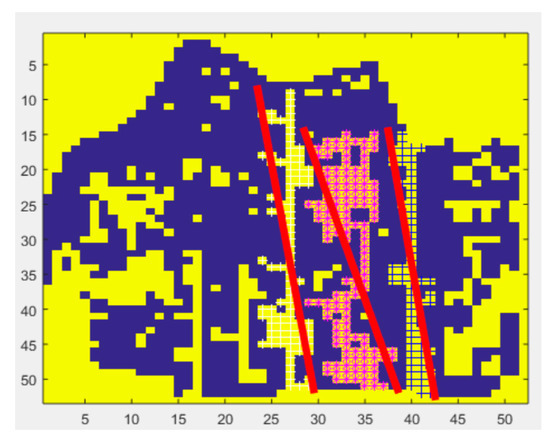 This graph is converted into a binary chart with FAD < 0.35 in the system to ease mining. Corridor parameters are input on the interactive interface, such as width ≥ 80 m, length ≥ 2000 m, and angle < 450 with the dominant wind direction. The system automatically extracts each area with pixel value of 1 for FAD < 0.35 to form a binary map with potential ventilation corridors. See Figure 10.