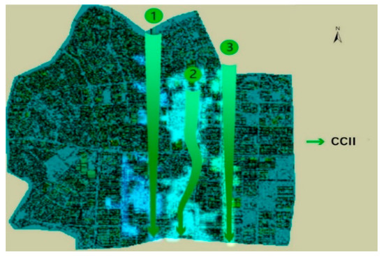 The dominant wind direction in winter was selected. The minimum width was 80 m, the minimum length was 2000 m, the angle between corridor direction and the prevailing wind direction was <45 degrees as the standard, and the system mined three corridors, which can provide a reference for the secondary ventilated corridor in the urban ventilation system (Figure 14). The mining results show that no. 1 and no. 3 corridors introduce natural wind into urban areas from the outskirts, and the spatial carrier is the urban main trunk roads. The no. 2 corridor starts from the citizen park and forms a continuous channel along the low and sparse plots of buildings such as squares, middle schools and kindergartens.