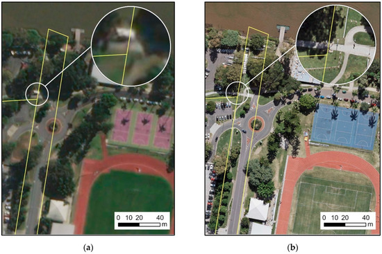 Figure 1b that has orthoimagery with a spatial resolution of ±0.1 m; there is a visible mismatch between the mapped parcel boundaries and fence lines. The orthoimagery has a positional accuracy of 0.2 m, so something is misaligned. The same issue of a spatial mismatch would also be apparent on the ground for locating features using low-cost GNSS devices with corrected coordinates via signal augmentation [