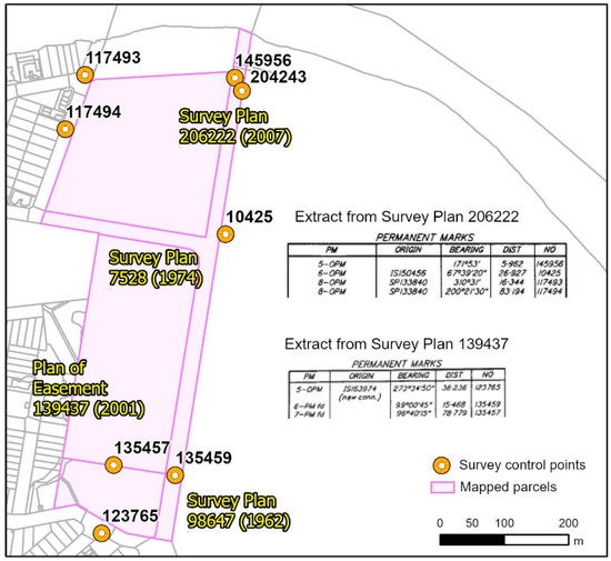 30]. Despite being a small area of just 4 parcels and 40 boundary lines, it does exemplify cadastral mapping problems. The two main problems are: (i) parcel corners with positional errors greater than ±1.5 m (as discussed in Introduction), and (ii) a poor degree of conformity with original survey dimensions.