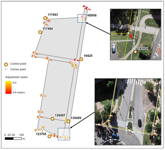 13] is used for the adjustment. It provides tools to prepare data for adjustment, which includes setting accuracies on control points, connections and boundary lines. Datum control points were constrained to be fixed, and coordinate-derived line distances and directions are given low accuracies, ±1 m and ±1/10 degree, respectively. In a least-squares adjustment, the accuracies act like weights, where low-accuracy measurements have a lower influence on fixing the adjusted geometry. Further details on the adjustment process may be found in ArcGIS documentation for Parcel Fabric [