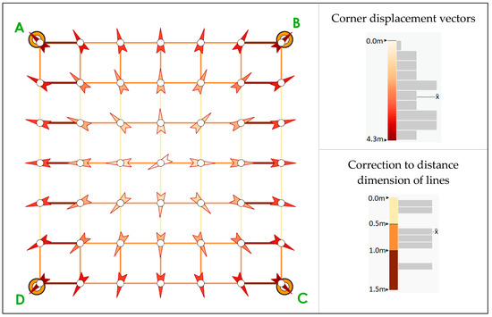 Figure 4 as arrows, have a uniform pattern of displacement outwards to fit to the four control corners. Changes to edge distances should be approximately 1 m, but this is not exactly as expected due to the iterative adjustment process.