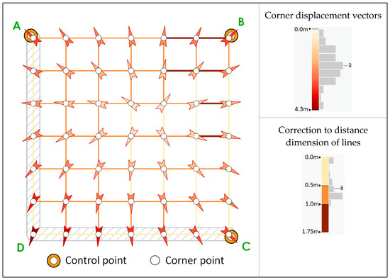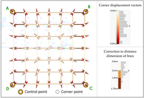 The adjustment is analogous to stretching the grid in a rubber-sheeting sense, where moving points outward indicate stress, and corrections to edge distances indicate strain. Edges have a post-adjusted standard deviation for distance of ±0.3 m (an improvement from ±1.0).