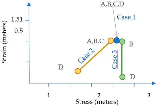 Figure 7 summarizes the three cases in terms of stress–strain relationships for points and lines just at corner locations. Case 1 has evenly distributed survey control so adjustment causes uniformly scaled position displacements (stresses) and edge dimensions corrections (strained) at corner locations labelled A, B, C, D. Case 2 has unevenly distributed survey control, and the corner labelled D is adjusted less, resulting in the grid being warped. Case 3 similarly has uneven survey control but is braced with correct measurements along sides A–D–C, so the edges associated with these sides are stiffer and are moved into place as opposed to being distorted.