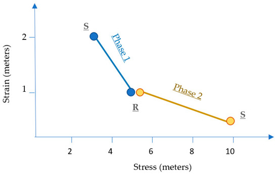 Figure 8 shows the stress–strain chart for post-adjustment of the cadastral mapping. Phase 1 employed a least-square adjustment with available control distributed across the study area. Most corners required coordinate displacements to fit with survey control, the largest being near the river (labelled R), but they had a regular easterly pattern for most corner points and boundary distance corrections of approximately 1 m. The anomaly was at the southern end of the road (labelled S), where there was localized variation in corner displacements and larger boundary distance corrections.
