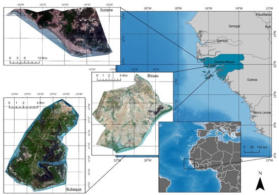 This work selected three low-lying coastal sections, which represent typical coastal environments of Guinea-Bissau: (1) Bissau City (hereinafter referred to as Bissau) is the country capital, located in the North Center; (2) Bubaque Island (hereafter referred to as Bubaque) is located in the South and part of the Bijagós Archipelago; and (3) Suzana Section (henceforth referred to as Suzana) located at the Northwest (Figure 1).