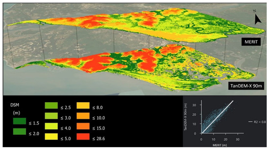 The TanDEM-X dataset is a Digital Surface Models (DSM), which means that the measured Earth’s surface height includes any surface objects, thus not representing the bare surface (or Digital Terrain Model (DTM)) [17]. Although, DSM are not the ideal datasets for flooding studies, they are the only available topographic dataset for several areas of the world, and a common typology of spaceborne global digital elevation models. Wessel [59] states that TanDEM-X 0.4 arc-second DEM presents a mean error of −0.17 m and RMSE of 1.29 m for kinematic GPS points and a mean error of 0.12 m and RMSE of 1.42 m for GPS-on-BM points; RMSE values for ground level in developed and forest areas show slightly higher deviations of ±1.4 m and ±1.8 m, respectively, whereas the low vegetation class remains with a RMSE of ±1.1 m. According to Hawker et al. [17], TanDEM-X 90 DEM, which is an average of the TanDEM-X 0.4 arc-second DEM, presents the best vertical accuracy results at floodplains for bare soil, shrubland, sparse vegetation, and urban land cover types, only surpassed by the MERIT dataset for short vegetation and tree coverage types. The same authors concluded that TanDEM-X 90 and MERIT have a similar accuracy, and both MERIT and TanDEM-X 90 are more accurate than SRTM, being the latter the most used DEM. Thus, TanDEM-X 90 presents a mean error of 1.06 m, mean absolute error of 1.74 m and RMSE of 3.16 m for floodplains [17]. Both TanDEM-X datasets present the best compromise between availability of data for the study area and accuracy. This is corroborated by Figure 2, where a comparison between the MERIT and the TanDEM-X 90 m DEMs for the area of Suzana is presented. Generally, can be observed that both DEMs are similar, with a R2 correlation of 0.8, but TanDEM-X presents higher values for higher areas and MERIT presents higher values for lower areas. Because both seem to correlate well and the original TanDEM-X dataset is more recent than MERIT, thus representing more truly coastal areas that are in constant change (e.g., sand spits), the TanDEM-X 90 m dataset was the one chosen to use for the Suzana section area.