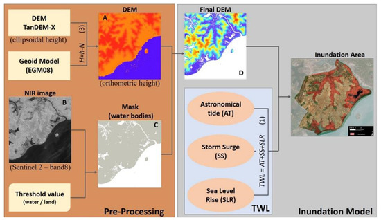 Flowchart of the DEM pre-processing procedures and the inundation model used in this study.