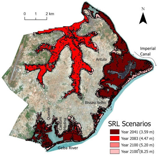 In Bissau, the flooding penetrates to the inland through the Geba River and Imperial Canal, covering low wetland/swampy zones, that meander the city, reaching several kilometers (see Figure 4). These lowlands, used mainly for rice growing and horticultural production, are, in general, already areas naturally flooded, but converted into cultivation fields, locally known as bolanha (large swampy terrain, usually near a river, where rice is grown or can be grown), through the construction of “anti-salt” dikes located downstream of the river arms, thus preventing the passage of salt water upstream. Presently, rice crops in these areas are sometimes affected by coastal flooding when, besides the overwash, there are also the breaking of anti-salt dykes due to high tides or SS, as happened when Tropical Storm Fred in 2015 hit Bissau. SLR will tend to reduce the urban and peri-urban agricultural land, as ever-larger areas will become permanently or frequently flooded, compromising the cultivation of rice and other crops, livelihood of many families, which, according to [71], are already threatened by the rapid disordered urbanization in recent decades.