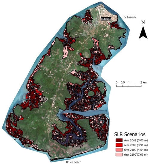 The results of the extent susceptible to coastal flooding for different areas and periods, superimposed on the satellite image, is illustrated in Figure 4, Figure 5 and Figure 6. The visualization of the flood map allows to perceive spatially the distribution of the exposure and possible impacts of different SRL scenarios. In regard to the spatial pattern of the mapped inundation, the existence of river arms connected to the sea is paramount to allow the inundation areas to be represented further inland. This is particularly visible in Bissau, where a big low-lying area is inundated further in land, in contrast with Bubaque, where inundation patterns are all represented along the out-skirts contours of the island and never in-land.