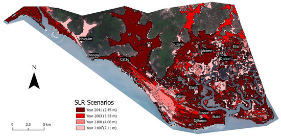 If the SLR scenarios considered in this study are verified and if adaptation measures are not taken, the villages of Djobel, Elabab, Elia, Bulol, Eossor, Djifunco, Arame, and Catão will need to be abandoned before the year 2041; and by 2083 the village of Edjim will go through the same situation as currently Djobel is facing and will need to be abandoned as well; and if the collapse of the Antarctica occurs in 2100, Suzana and Nhiquim will also be affected (see Figure 6).