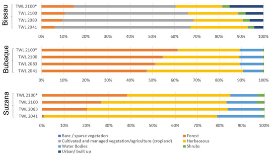 The Guinea-Bissau study areas only presented the following land cover classes: (a) Bare/sparse vegetation; (b) Cultivated and managed vegetation/agriculture (cropland); (c) Urban/built up; (d) Forest (which includes the classes (i) closed forest, deciduous broad leaf, (ii) closed forest evergreen, broad leaf, (iii) closed forest, unknown, (iv) open forest, deciduous broad leaf; (v) open forest, evergreen broad leaf and (vi) open forest, unknown); (e) Herbaceous (which includes the classes herbaceous vegetation and herbaceous wetland); (f) Shrubs; and (g) Water bodies (which includes classes open sea and permanent water bodies).