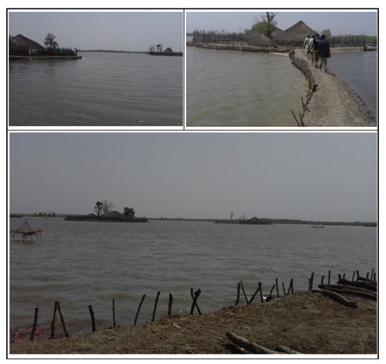 In Suzana, the flooding extends more to southeast, precisely close by the Cacheu River estuary, a low-lying region where several villages have developed, some of them completely isolated by river arms: Djobel, Elia, Bulol, Djifunco, Eossor, Elalab, Arame, and Edjim (see Figure 6). These villages, which concentrate a large part of the Suzana’s population [36], are already affected by flooding, which mainly impacts agricultural land and housing. Of these villages, Djobel, an island with 223 inhabitants [36], deserves special attention. The village is practically covered by sea water during spring tides, forcing the inhabitants to build dikes and to raise the land around the houses to protect them (Figure 9). In the period of spring tides, the mobility is reduced since, at that time, the movements from one morança (Set of houses, in a village, in which inhabits a single familiar aggregate) to another can only be done by canoe or using the dike pathway, which have an insufficient coverage. Agriculture on this island has been affected by saltwater intrusion in cultivation fields, due to the frequent rupture/overtopping of anti-salt dikes by the sea water. Additionally, due to saline intrusion, the inhabitants of Djobel no longer have fresh water, having to travel some miles by canoe to fetch it from neighboring villages.