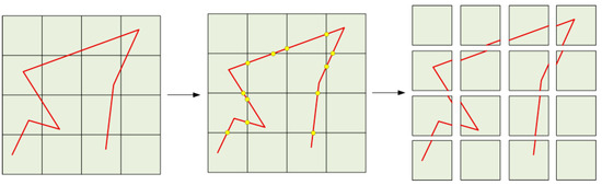 In order to segment a polyline, we propose a point tracking method. As shown in Figure 3, starting with the beginning point of a polyline, the correspondence between each node of the polyline and vector tile is calculated. Vector data within the spatial range corresponding to the vector tile will be saved to the current vector tile.