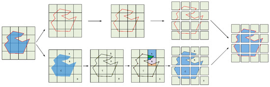 For internal polygon segmentation, we designed a tile tracking method, as shown in the lower half of Figure 4. There are two cases for the relationships between a vector tile and a polygon that we identify as cases one and two. In case one, there are edges of polygons in a vector tile, such as vector tiles A and B in Figure 4. In case two, there are no edges of polygons in a vector tile, such as vector tiles C and D. In case one, a vector tile is divided into two (vector tile A) or more portions (vector tile B); therefore, we need to individually determine the relationship between each portion and polygon. In case two, we need to determine if the spatial range corresponding to the vector tile belongs to the polygon (vector tile C) or the spatial range corresponding to the vector tile does not belong to the polygon (vector tile D).