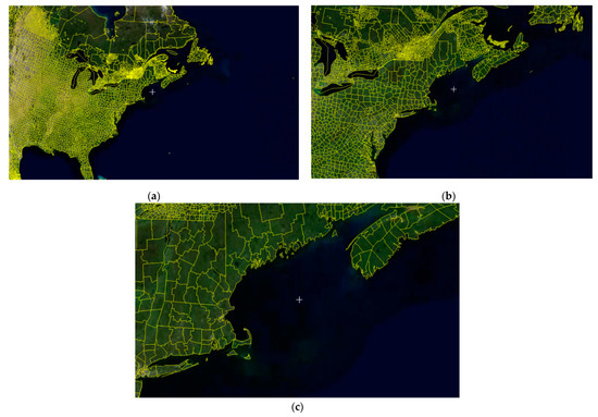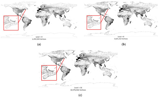Figure 6a–c show the global administrative map at different levels. The numbers below each successive image represent the level number and the number of vertices of the vector tiles at that level of the VTPM.