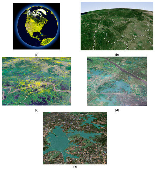 Supported by Geoglobal, a commercial software platform such as Google Earth, rendered vector data are shown in Figure 7. Figure 7a was created using a geometry-based method to visualize a global administrative map onto a global 3D terrain surface. In Figure 7b, a texture-based method was used to render the global rail data. Figure 7c shows vector data rendered using a combination of the two methods: a texture-based method for the global rail data, and a geometry-based method for global roads. Figure 7d,e show a visualization of the Wuhan lakes and woods polygon in 3D.