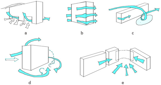 Example of visualization of some wind effects: (a) effect of slots under a building, (b) effect of corners, (c) row effect (d) wake effect and (e) Venturi effect, based on Gandemer’s [1] sketches. Image from [10].